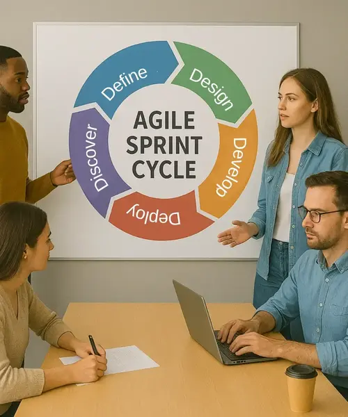 Every sprint begins with focused discovery, which involves understanding priorities, user goals, challenges, and technical considerations. Unlike traditional discovery phases, this step repeats throughout the project, ensuring decisions reflect new insights and user feedback.